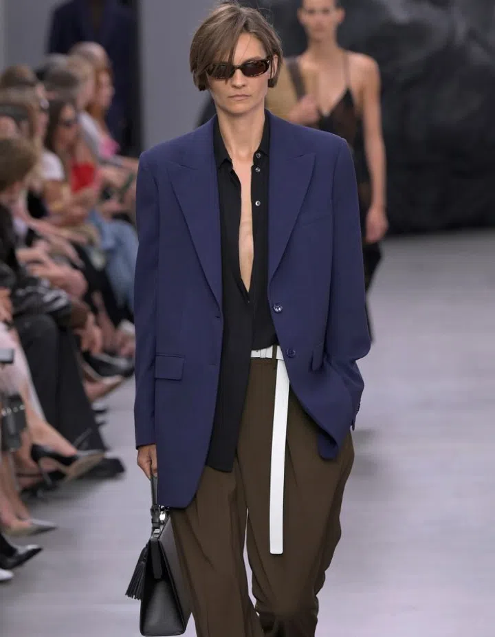 Casual suiting done right for summer - a nonchalantly unbuttoned shirt styled with a navy blazer and loose-fit dark chocolate trouser. To break the monotony of the darker colours, the detail of the stark white belt is genius.