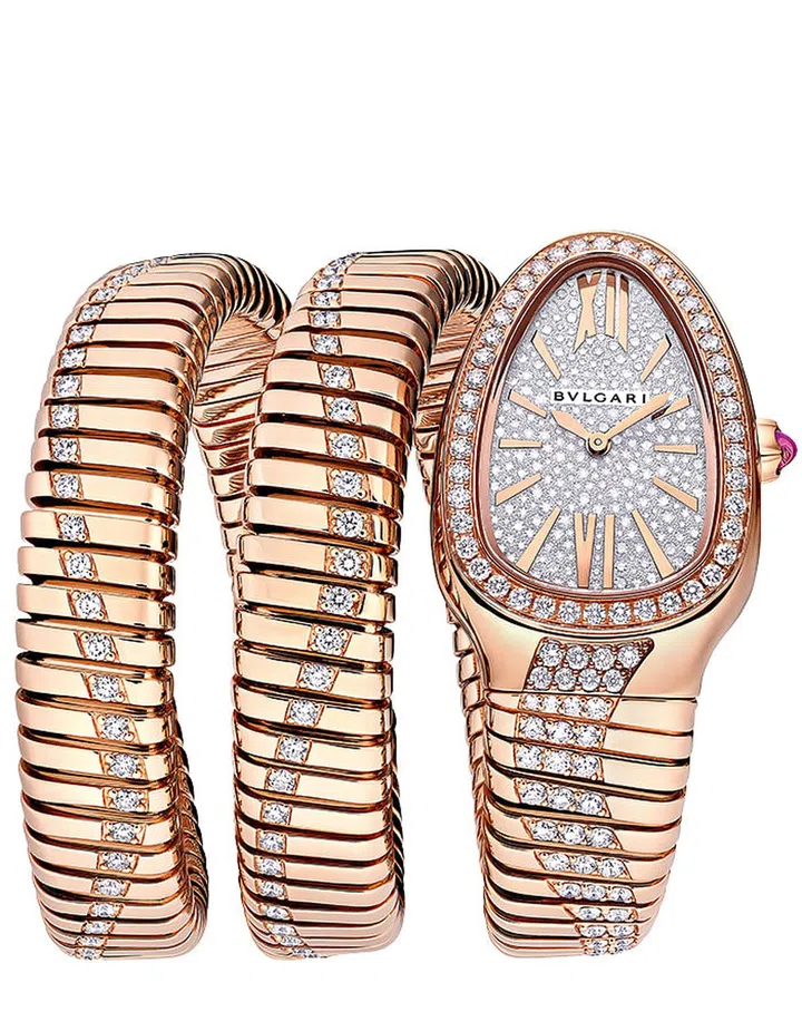 The Serpenti Tubogas Infinity comes in rose gold, with diamonds on the Tubogas, dial and bezel.