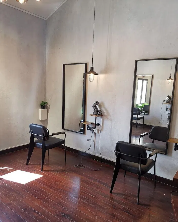 The salon is a cosy, light-filled space with warm wooden parquet flooring. A large industrial-looking chandelier takes centre stage in the main salon area where there are six metallic chairs for customers. There are also two additional seats on the loft above.