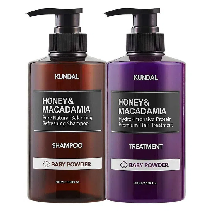 Best repairing shampoo and conditiner: Kundal Honey & Macadamia Shampoo + Hair Treatment – Baby Powder, $10.50 each