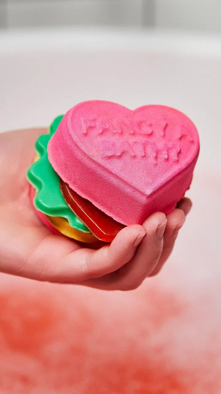 Nothing says “I love you” quite like a decadent burger. Even better, this hardworking vegan bath bomb from LUSH features two cherry-scented burger buns, a sicilian lemon-scented burger patty bubble bar and two rhubarb and custard scented soaps.