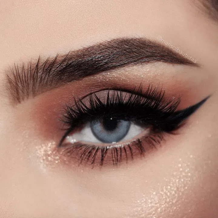 Since the look is rather bold with its cat eye flick, wearing a glossy nude lip would be a better option than a red lip.