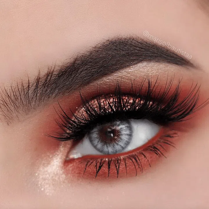 Sweep a light brown shadow across your eye. Then apply a burnt orange shade to your crease and lower lash line, and blend well. For the red hues, apply a burgundy-red shade over the same areas, and over the outer corner. Deepen the crease with a dark brown shade and sweep it across your outer lash line as well. Apply an amber shimmery shadow over it, and a subtle silver shade on the inner corner, tear duct and brow bone. Lastly, add a glittery red shadow to your lower lash line.