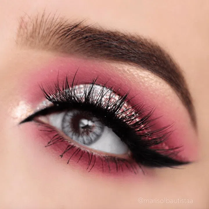 Start off with a fuschia pink shade all over your eye and intensify the crease with a dark purple shade. Apply the dark colours along the lower lash line too. Then apply silver glitter, like this one from Beauty Bakerie on the inner lid to the middle of the eye, and blend this with a red glitter on the outer half of the lids, finishing in a cat’s eye flick. Then accentuate the inner corners of the eyes and brown bone with a soft, shimmery beige shadow.