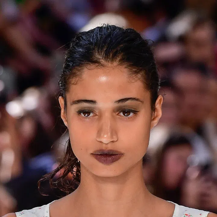 Black lipstick doesn’t sound like the most wearable thing around, but the soft stained lips at Molly Goddard just about changed our minds. Paired with low messy buns, the overall look was, dare we say it, ethereal. The iteration at Marques’Almeida, however, went high octane with shiny, almost vinyl-like lips.