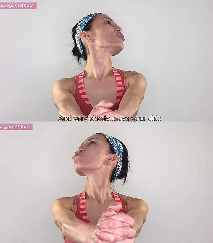 Clench your hands in a fist, and straighten your arms out before you to feel a wide, upper back stretch. Then, roll your head slowly and upwards in a 45 degree angle to face the ceiling, and pucker your lips to feel the full stretch on your face and side of your neck. Repeat this on the other side.