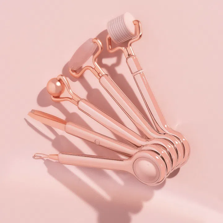 If you love rollers and are looking for an affordable set, then this set might be your cup of tea. This set features three rollers (professional derma roller, rose quartz face roller, de-puffing eye roller), a comedone extractor, and a precise tweezer. The tools can be used to enhance product absorption into the skin.