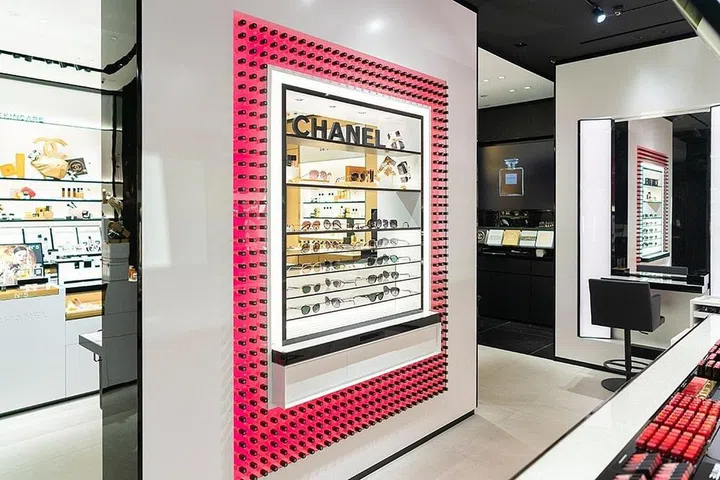 On one hand is the Chanel Beauty Studio, a bright, sleek and futuristic space dedicated to everything makeup-related. Akin to an art gallery, this area boasts a pink wall created with 2,164 lipstick tubes that are illuminated from within, creating a modern animated 3-D mural.