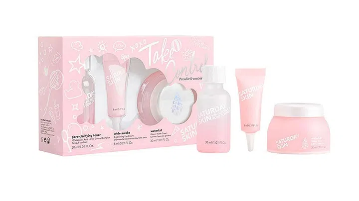 A fun pink-hued skincare set to get the glow on. The Pore Clarifying Toner smoothes and refines skin texture with 10 per cent glycolic acid, the Wide Awake Brightening Eye Cream illuminates tired eyes, and the Waterfall Glacier Water Cream infuses skin with moisture for a bright and supple complexion.