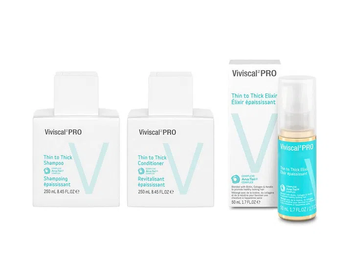 To complement the supplements, add the new Viviscal Professional Thin to Think Hair Care range, which compromises of a shampoo, conditioner and leave-in treatment, to your haircare regimen. Formulated with ana:tel, a proprietary complex that includes clinically tested actives like pea sprouts, along with biotin, collagen and keratin, the trio work together to make hair look and feel healthier.