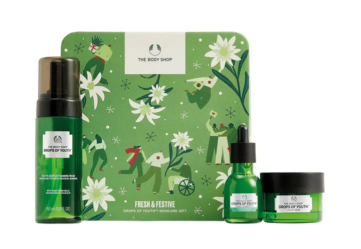 The Festive & Fresh Drops of Youth Skincare Gift includes a Gentle Foamwash, Concentrate, and corresponding Youth Cream to give you smoother and fresher-looking skin.
