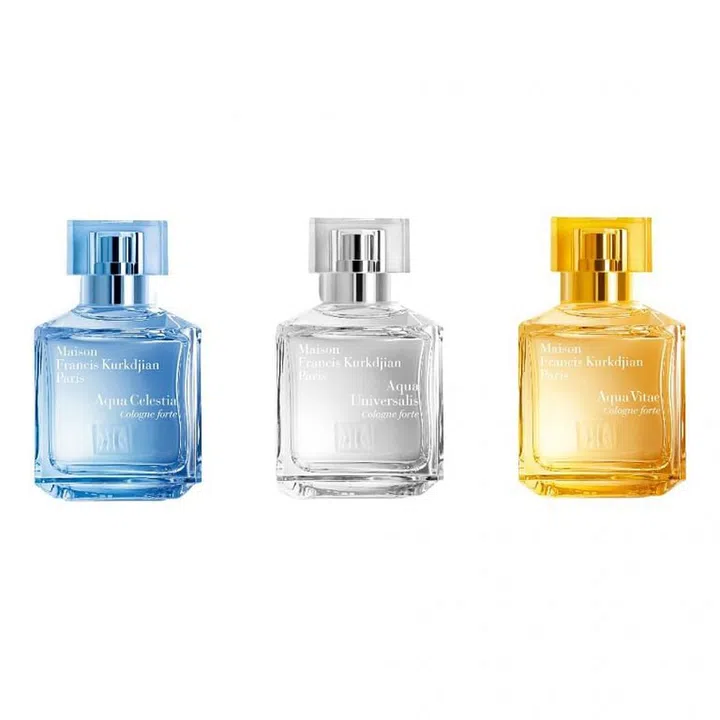 Bergamot and white flowers such as mock orange and sweet pea commingle in Aqua Universalis (the one in the silver bottle) to embody radiance; the blend of musky sandalwood and sprightly mandarin in the gold-bottled Aqua Vitae is meant to conjure a balmy, sun-soaked mid-day; while Aqua Celestia contains notes of juicy blackcurrant and mimosas to evoke the cool, crystal-clear light of dawn.