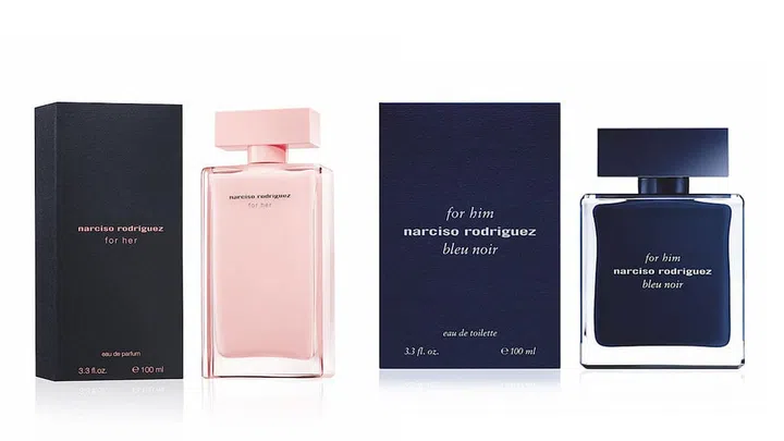 From left: Narciso Rodriguez For Her EDP, $184 for 90ml; Narciso Rodriguez For Him Bleu Noir EDT, $139 for 90ml.