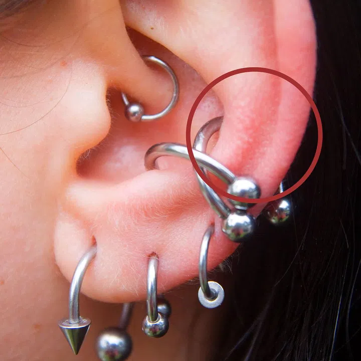 Known as one of the most common (and versatile) ear piercings, lobe piercings are positioned on the fleshy bottom part of the ear. What’s great about these piercings is that it’s easily customisable and you have a wide variety of jewellery options for you to choose from such as studs or hoops. On top of that, the lobes are often the first choice for those new to body modification as it’s simple, heals quickly, and doesn’t hurt as much.