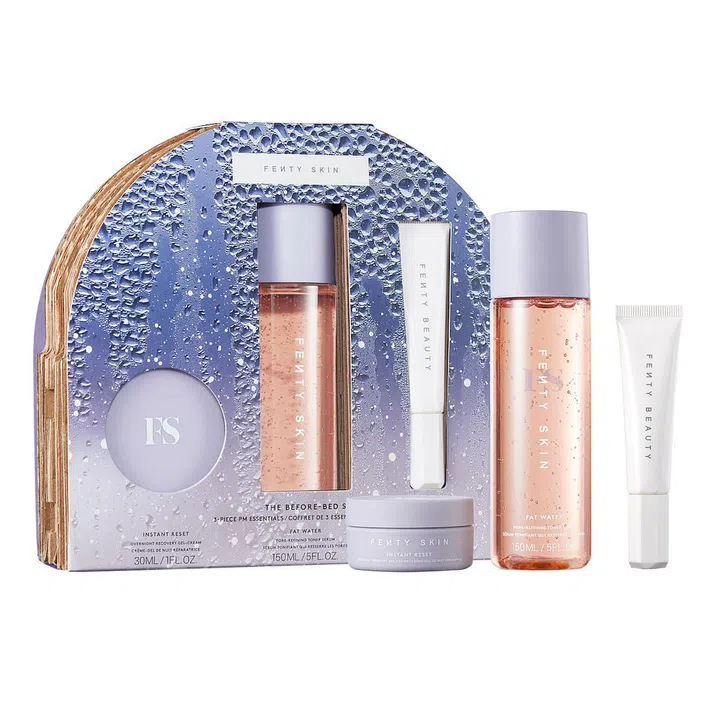 The Fenty Skin Before-Bed set features the Fat Water Niacinamide Pore-Refining Toner Serum, mini Instant Reset Brightening Overnight Recovery Gel-Cream, and a Fenty Beauty Pro Kiss’r Luscious Lip Balm in shade “Hint Hint”, essentials for the best beauty sleep. You’ll definitely be waking up with that Fenty glow in the morning.