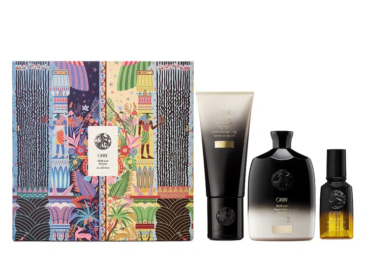Oribe partners with artists every holiday season to create limited-edition gift sets. This year, multidisciplinary artist and designer Louis Barthélemy was inspired by brand co-founder Oribe Canales’ glamour and spirit and took inspiration from ancient Egyptian art to craft three unique vertical works that take their inspiration from papyrus scrolls. Enjoy the Gold Lust Collection in this gorgeous and colourful packaging, featuring a Repair & Restore Shampoo, Conditioner and Nourishing Hair Oil, which rejuvenate hair and add lustre.