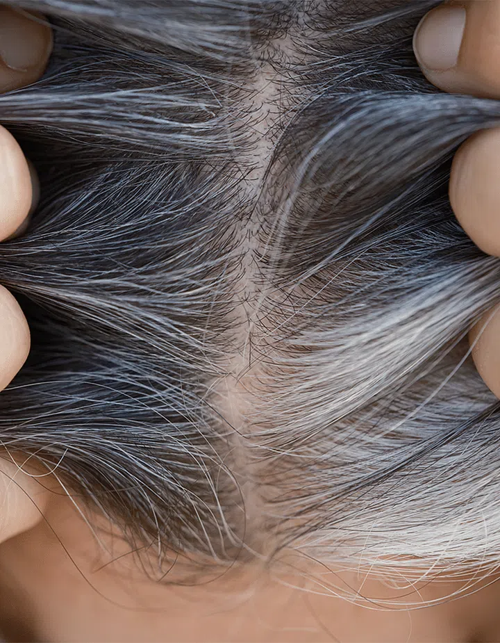 When we age, the number of ‘colour’ cells dwindle – resulting in lesser colour pigments in our hair. Therefore, we get the appearance of grey, patchy white, or literally colourless and transparent hair.