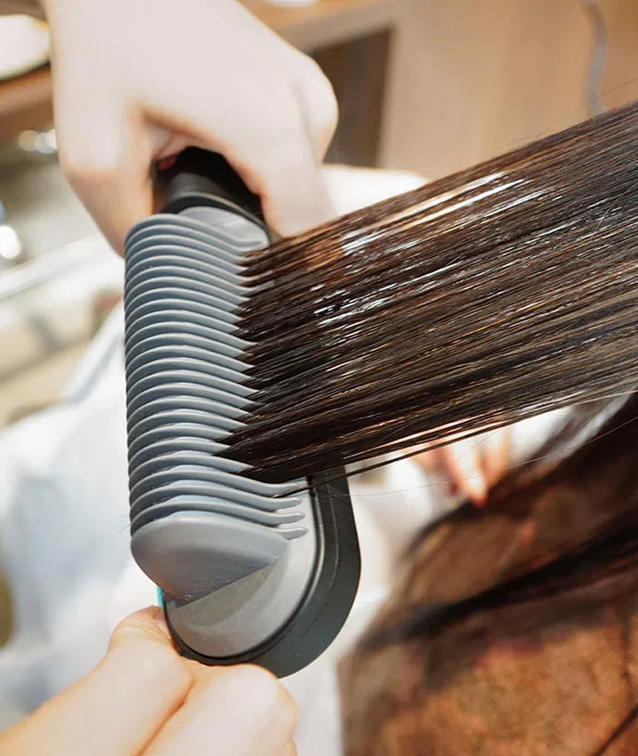 Then, a specialised brush iron is combed through the hair with just the right amount of heat to remove frizz and create a softer, glossier, and more natural-looking finish.
