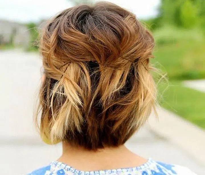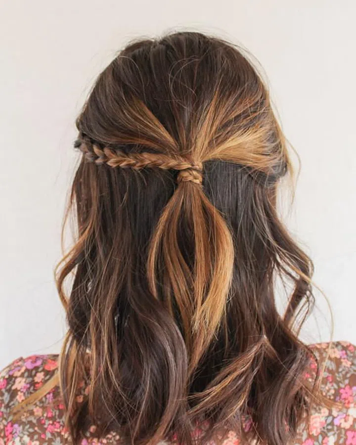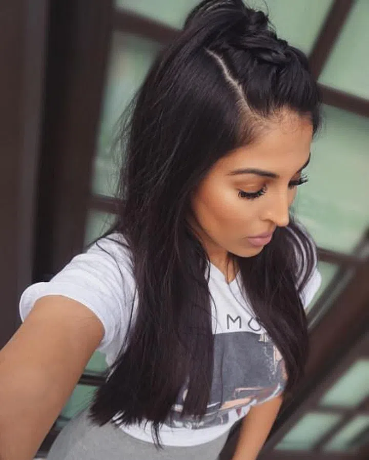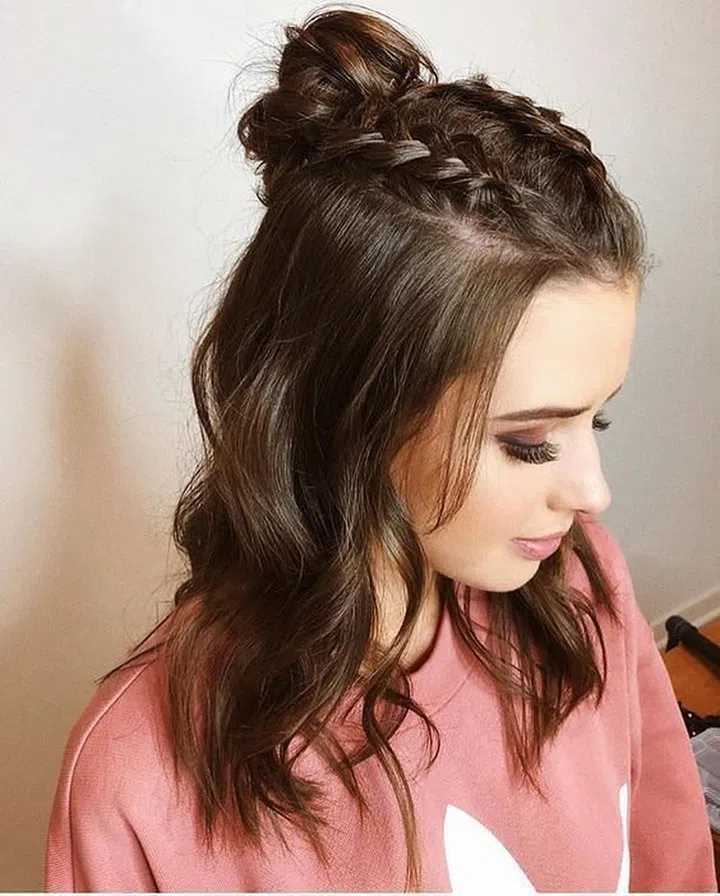 This simple yet sophisticated look involves braiding the top middle section of your hair until you reach the back, then tying it all up in a messy bun or ponytail.