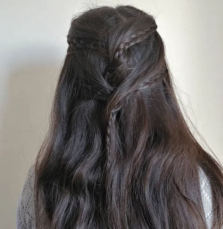 Section your hair at the crown into two or three braids, then tie them back into a bun to complete this gorgeous half-up do.