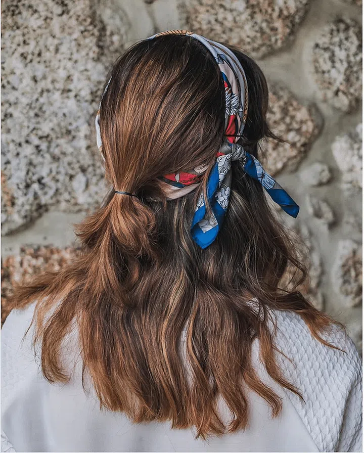 Headscarfs are back in trend, and they’re an easy way to instantly glam up your outfit. Use a bobby pin or two to keep it in place!