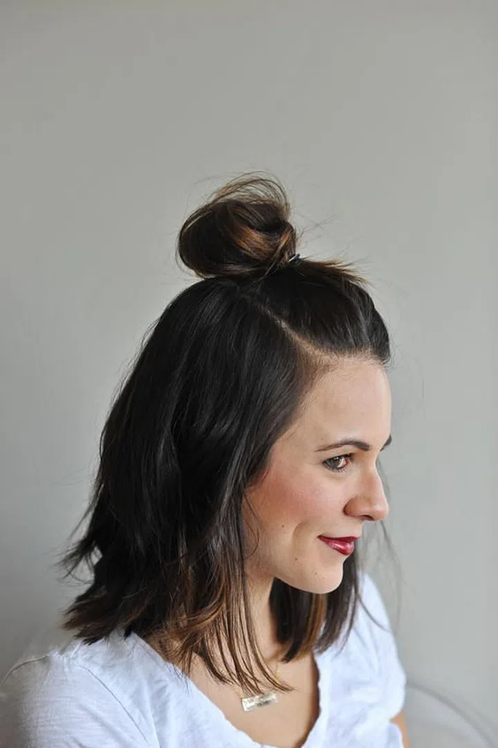 This one is so easy: grab a section of hair from the middle section starting from your forehead and throw it all into a messy topknot.