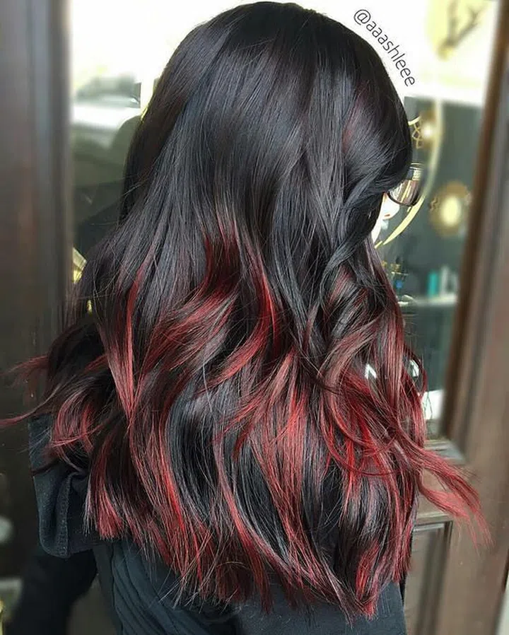 This look is great for those who hate obvious roots. Balayage technique with red and darker roots are extremely forgiving and easy to maintain when hair is growing out.