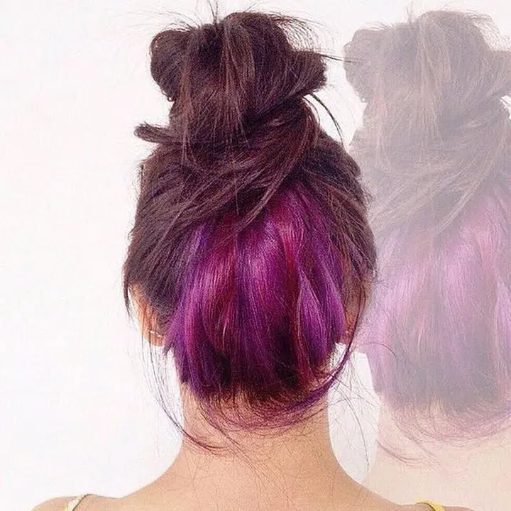 This is probably the hair version of “business in the front, party at the back”. When hair is let down the purple is virtually invisible, but once you have it up in a ponytail or bun, it reveals a gorgeous colour that’s been hidden.