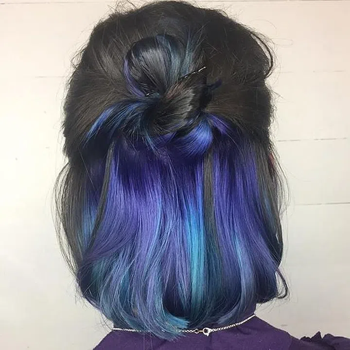 Short hair can also have their fair share of coloured fun with this hidden galaxy ‘do, with bright blues and purples showing when you tie up your hair in a half updo.