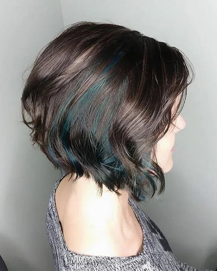 Hidden in between chic curls, this sea green colour gives a nice touch of surprise to light brown hair.