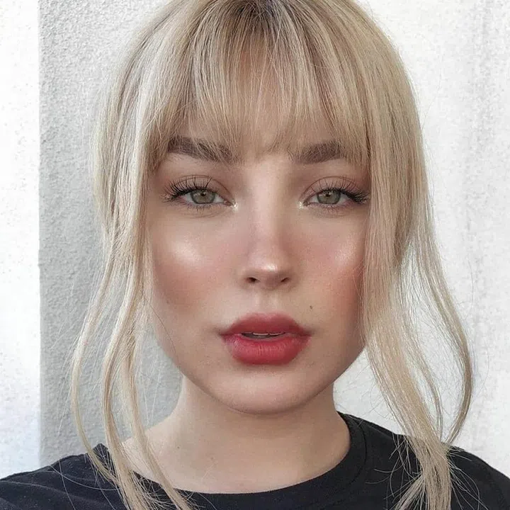 Blunt bangs can look pleasantly styled on thin hair, as the light and airy strands won’t look too weighed down on your forehead. We love how the strands around the face frame it beautifully, and we recommend this waterfall-like cut as well.
