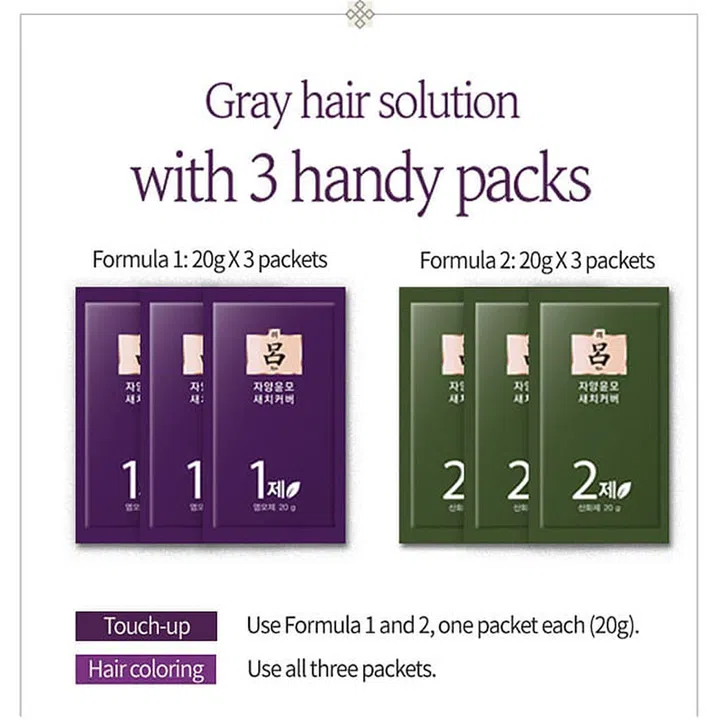 For easy application and to avoid wastage, the dye comes in 20 g packets so you only use what you need. To touch-up greying roots, use one packet each of Formula 1 and 2 (20 g x 2), while a full head of colour requires all three packets of Formula 1 and 2 (20 g x 6).