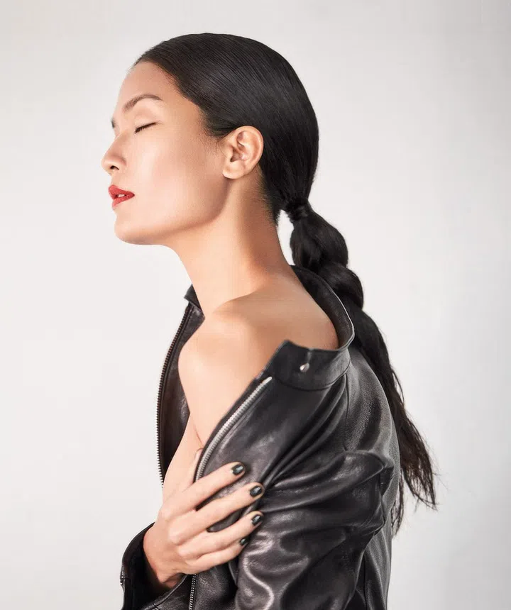 An elegant, futuristic take on the ordinary ponytail. “Apply gel from the crown to the nape, and slick down flyaways and baby hair. Use a fine-tooth comb to pull hair back smoothly and neatly, then secure with a hair tie. You can also apply a little gloss serum or soft-hold gel on the tail if you want that section to look wet as well, or have a fixed shape,” says Loke.