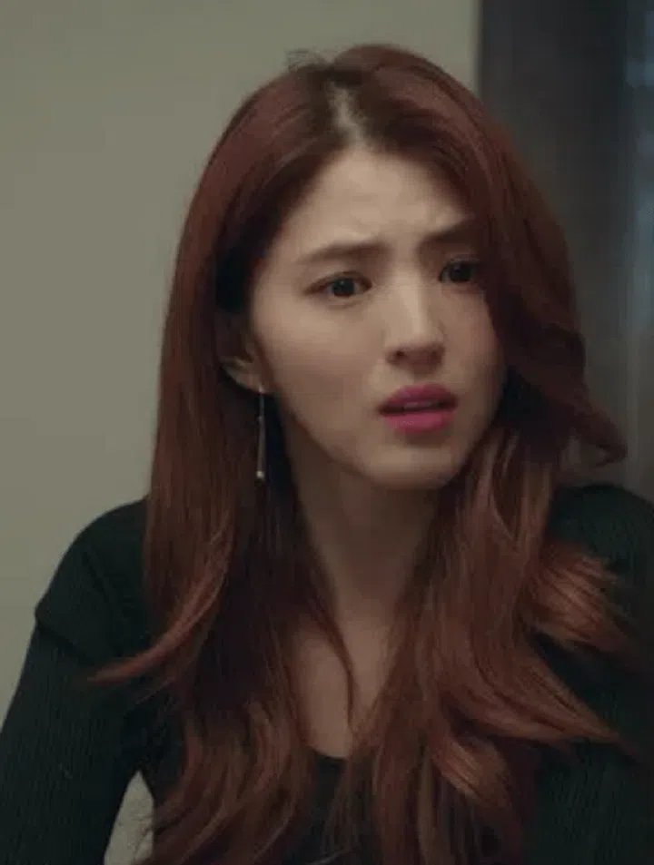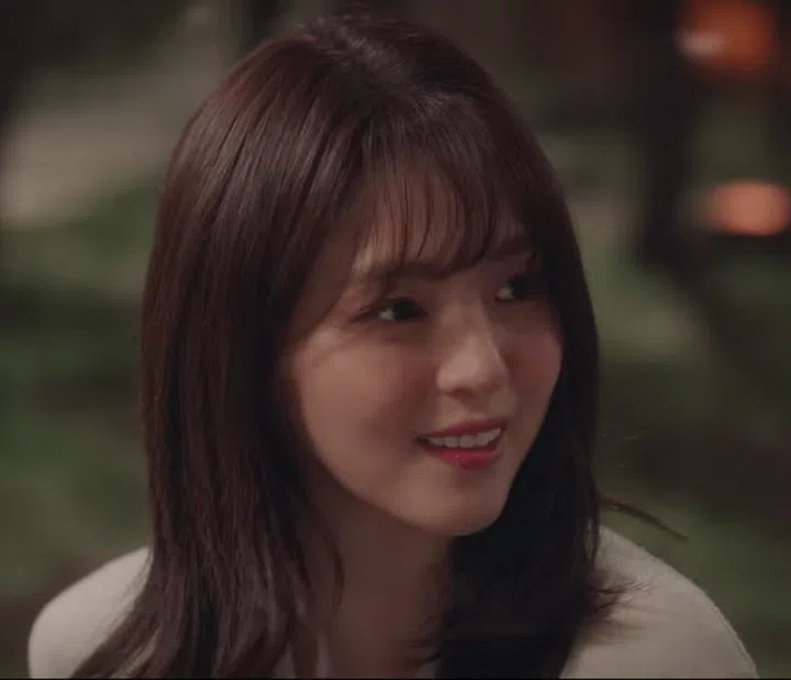 In this scene, Han So Hee debuts a warmer, caramel brown hairstyle. To complement her new hairdo, the makeup artist has chosen a warmer shade of pink that sways closer to a bright plum for her lips. Her brows are neatly drawn in a muted brown as compared to a more distinct grey that was apparent in her other scenes where she donned darker hair.
