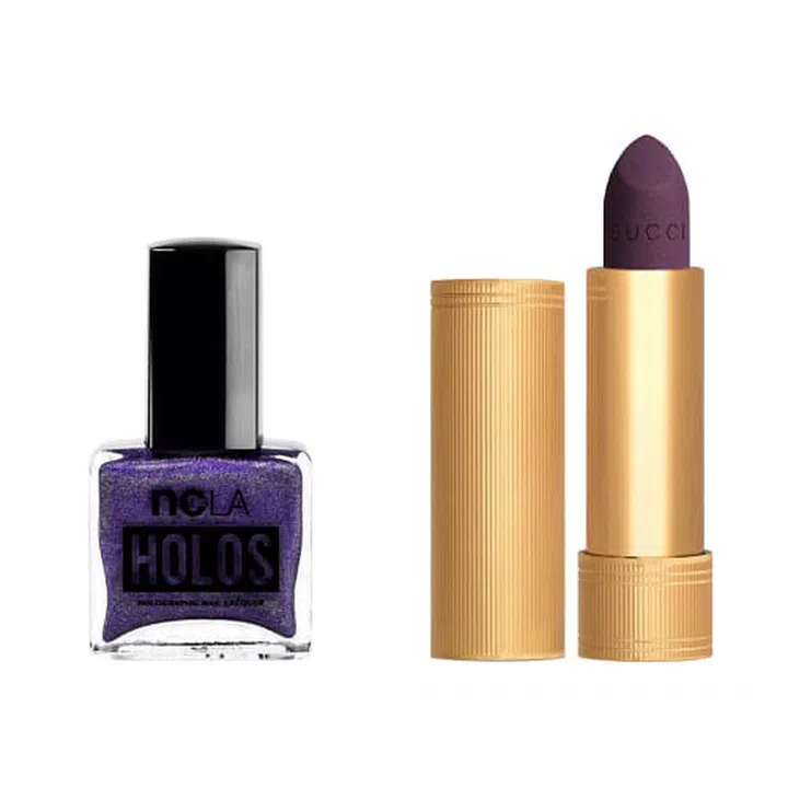 NCLA Out of this World Holos Nail Lacquer ($23) and Gucci Beauty Rouge à Lèvres Mat Matte Lipstick ($53)