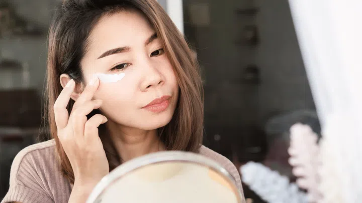 Apply a small amount of eye cream on the eye contours. Starting from the temples, use your ring finger to massage in small circular motions, following an oval path under the eyes and over the top. Repeat three times, concentrating on the under-eye areas to get rid of fluid accumulation. This will lessen the appearance of eye bags.