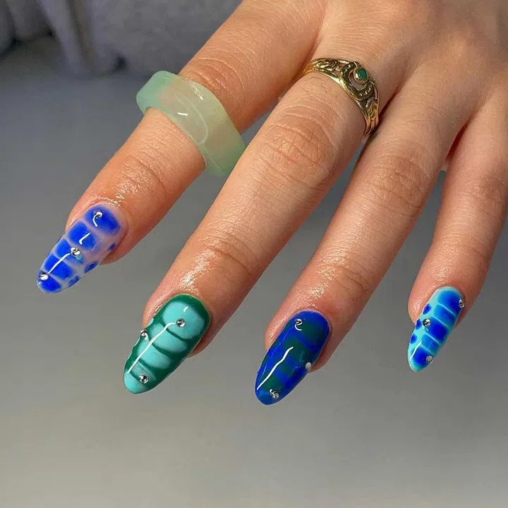 Speaking of three-dimensional nail art, another nail trend that’s been gaining popularity lately is blob nails. Here, squeezable gel, also known as drawing gel – a thick, transparent formula – is dispensed directly onto the nail before curing it under a UV lamp. As a result, you’ll get a funky nail design that comes in amorphous shapes, giving your nails more dimension and texture to your look.