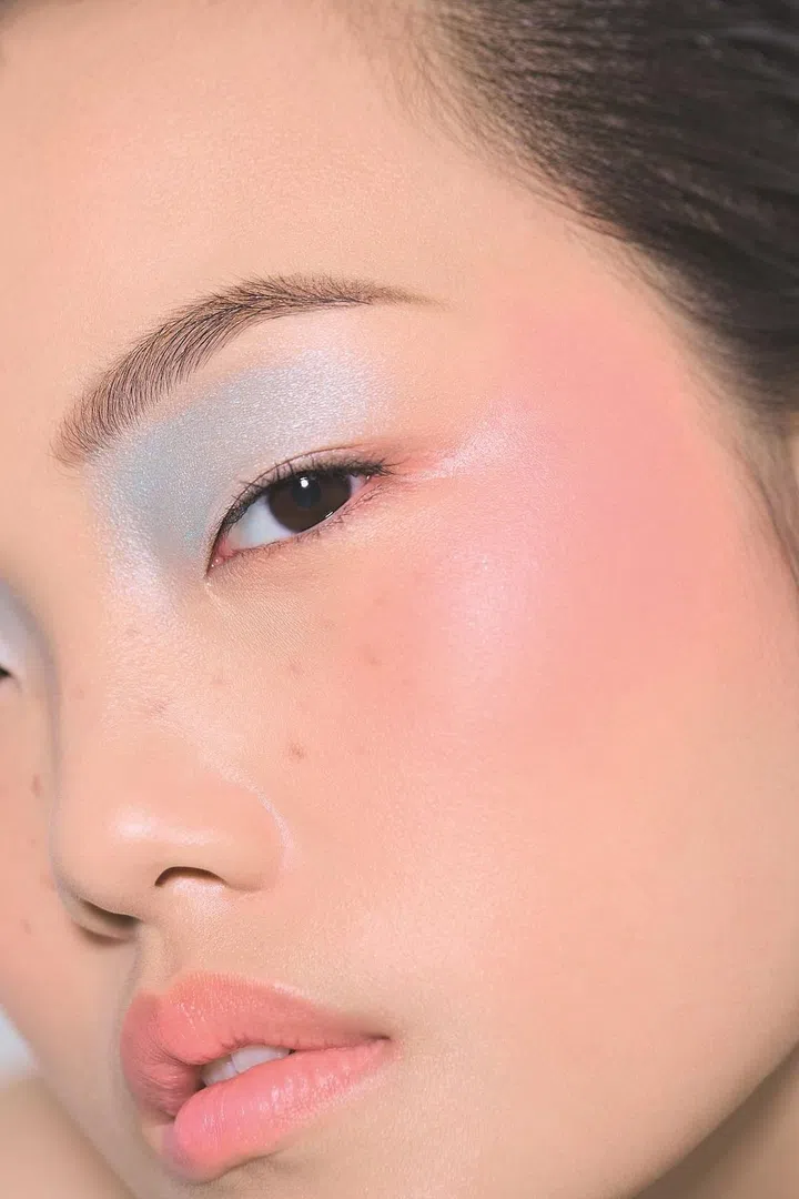Inspired by J-beauty, this popular “hangover” blush technique creates a sunkissed flush and subtle sculpting effect. To recreate, apply blush abundantly under the eyes, upper cheeks and over the bridge of the nose.