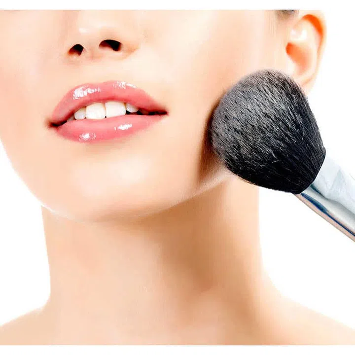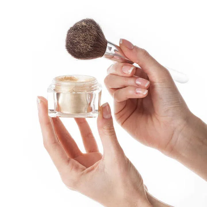 Lightly dust powder along the T-zone and jawline. Any more and you run the risk of making your foundation look cakey. To ensure you’re using just the right amount of powder, dip your brush into the tub, dust off the excess and then proceed to powder your face.
