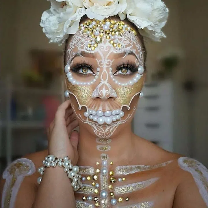 This is a more toned down prettified version of the sugar skull makeup. Instead of using bright-coloured liners, take a white liner and draw your desired design. Pack on golden glitter onto your cheeks and contour your face with a darker brown to emphasise the hollows of your cheeks.
