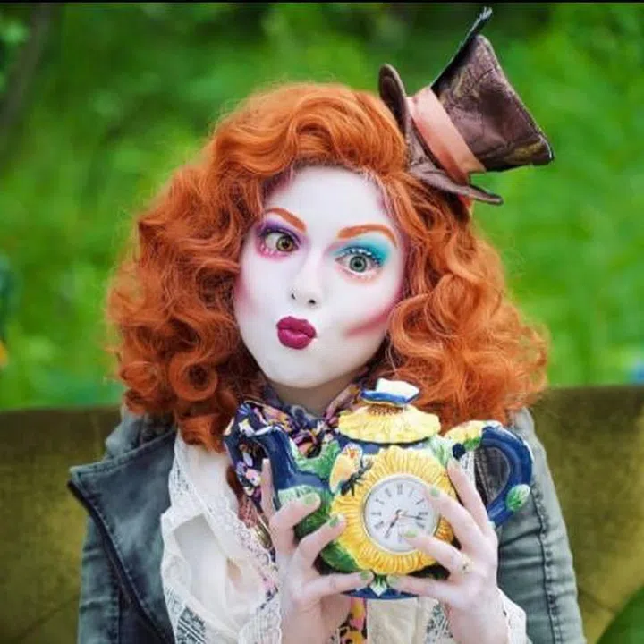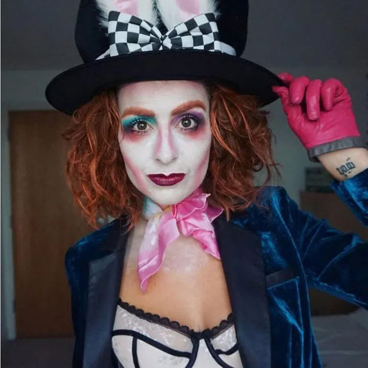 To achieve this look, start with a white base for your face. Continue by applying blue and purple eyeshadow on each eyelid. Draw on your brows with a bright orange shadow that should match the colour of the Hatter’s hair. And end off by contouring your face with a purple shadow.
