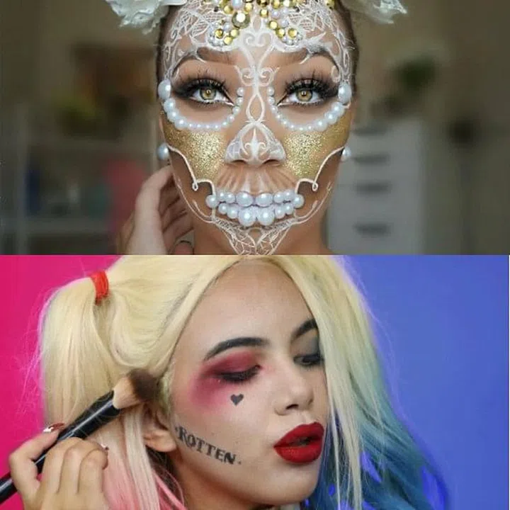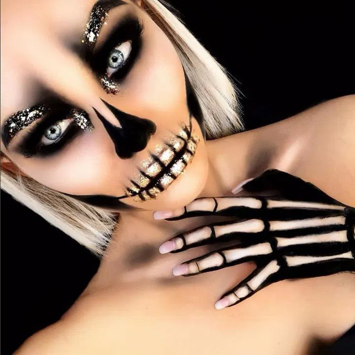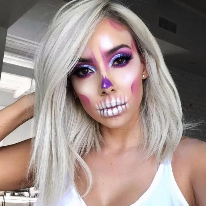 This skull makeup is definitely a go-to if you’re planning to stand out from the crowd. To achieve the look, use a black liner to carve out the hollows of your cheeks, teeth and nose. Next, take a black shadow to smoke out your eyes and create a nose contour.