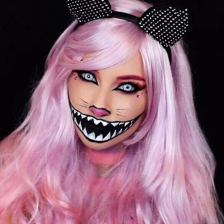 What’s Alice in Wonderland without the Cheshire Cat? To create its large grin, take a black gel liner and draw on a smile that stretches to your ears. Use a white liner and carve out sharp teeth then use the same black liner to shade between them.
