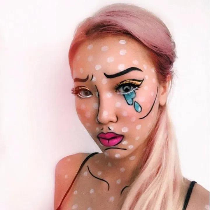 If you’re too lazy to add such intricate details onto your face to achieve that pop art effect, you can use a white eyeshadow to create dots. Draw on a few lines with black eyeliner and complete this simple look with a tear right below your eye.