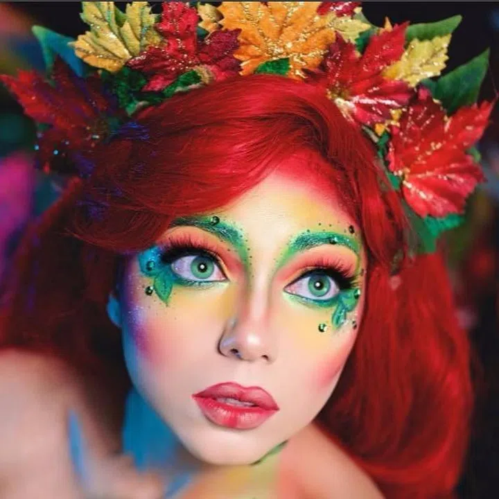 To look like Poison Ivy, use red, orange and yellow face paint in place of your contour powder and blend it towards your forehead. Fade the colours into one another for a sunset effect on your face.