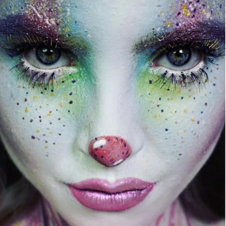 Take your favourite colourful eyeliners and create freckles in a triangular shape towards your forehead and mouth. Add falsies to your top and bottom lashes to really make your eyes pop. Contour your face with a purple shadow and finish off with a red nose and bright pink shimmer lipstick.