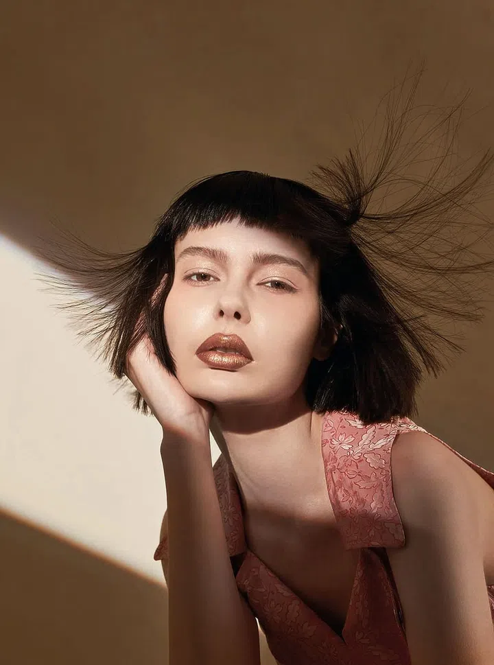 “I wanted to translate the idea of molten bronze to lips, the way its movement creates an interesting contrast in texture. It’s an effect that’s both sensual and luxurious. Use a warm-toned brown lipstick with a metallic finish as the base. Next, layer on a gold shimmery gloss; for a matte finish, use gold eyeshadow. For a stronger plumping effect, apply more gold to the centre of your lips.”