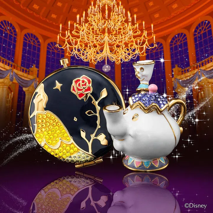The compact is not only designed with Belle's famous yellow gown, but also the rose, which plays a vital role in the fairytale's plot. The solid perfume features Mrs. Potts, and contains Beautiful Belle fragrance.