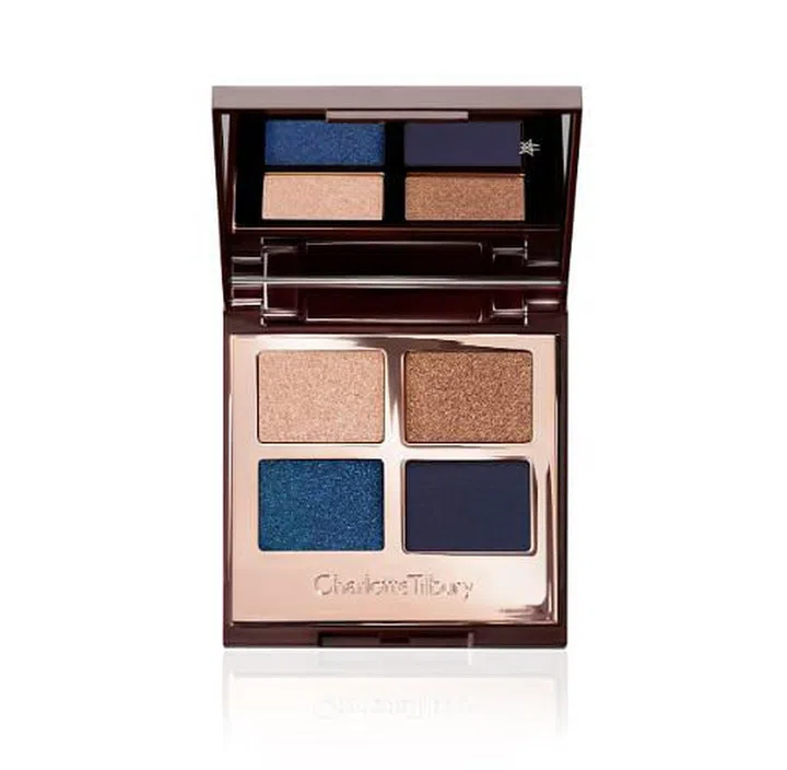 From deep navy hues in a matte finish to a metallic champagne-gold, this eyeshadow palette consists of four complementing shades to recreate the bold, blue eye makeup look. Blend out the striking shades with champagne and shimmering beige and brown to soften any harsh lines.