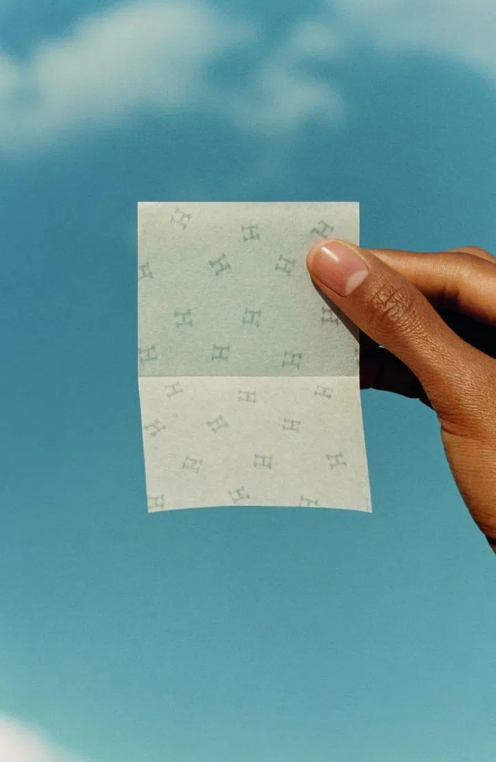 The blotting papers are adorned with small “H”s to create an airy print that feels light as air, and is housed in a small orange box that you can bring everywhere.
